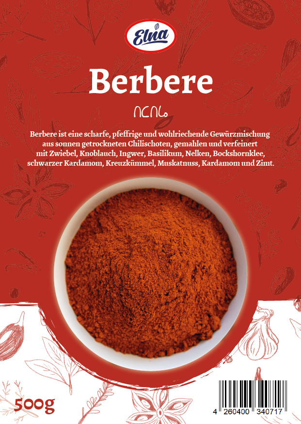 Berbere ist eine scharfe, würzige und aromatische Gewürzmischung aus sonnengetrockneten Chilischoten. Sie wird gemahlen und mit Zwiebel, Knoblauch, Ingwer, Basilikum, Nelken, Bockshornklee, schwarzem Kardamom, Kreuzkümmel, Muskatnuss und Zimt verfeinert.